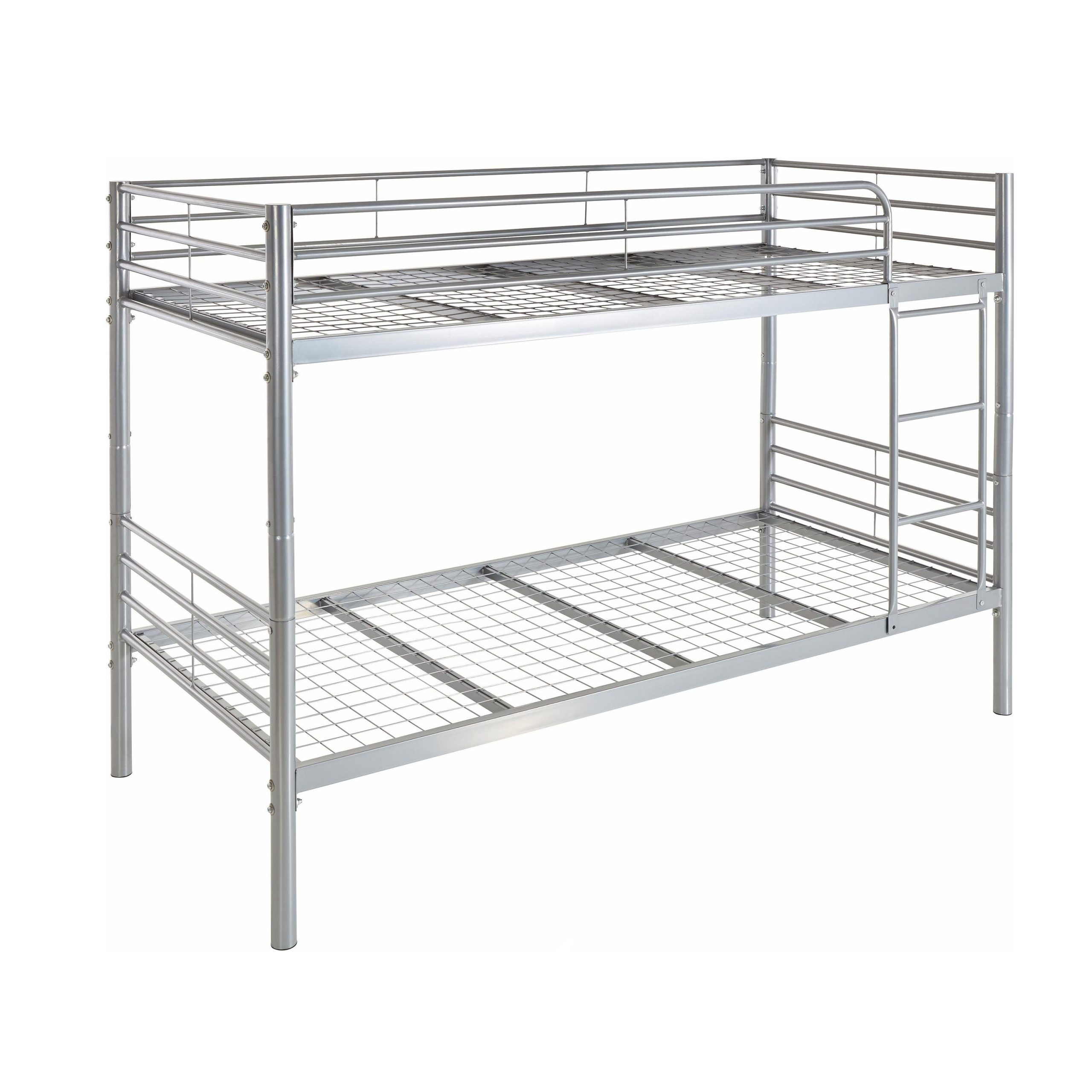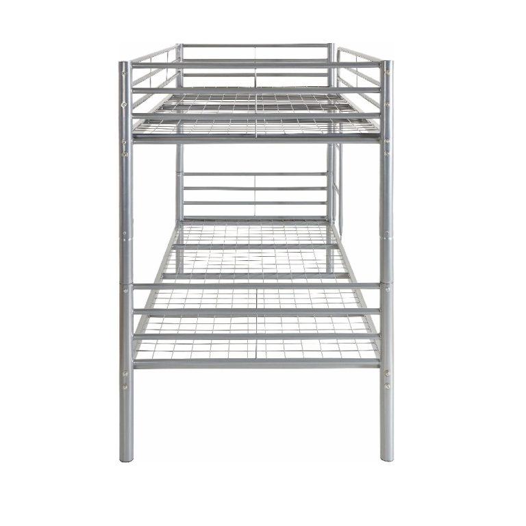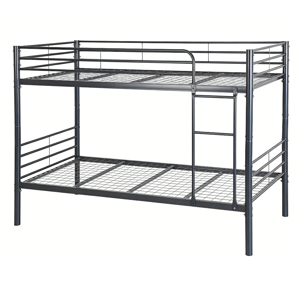 This adult bunk bed features a commercial-grade steel frame and a unique wire mesh decking system. It is designed to maximize floor space while providing a sturdy and ventilated sleeping platform for two adults. The wire mesh replaces traditional wooden slats, offering superior airflow and eliminating the need for a box spring.