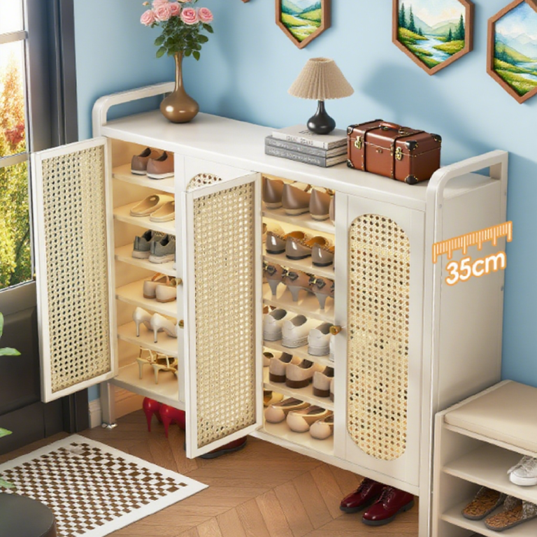 The Imitation Rattan Door Hallway Shoe Cabinet suits modern minimalist, Japanese, or Nordic-style homes, effortlessly improving the hallway’s look.