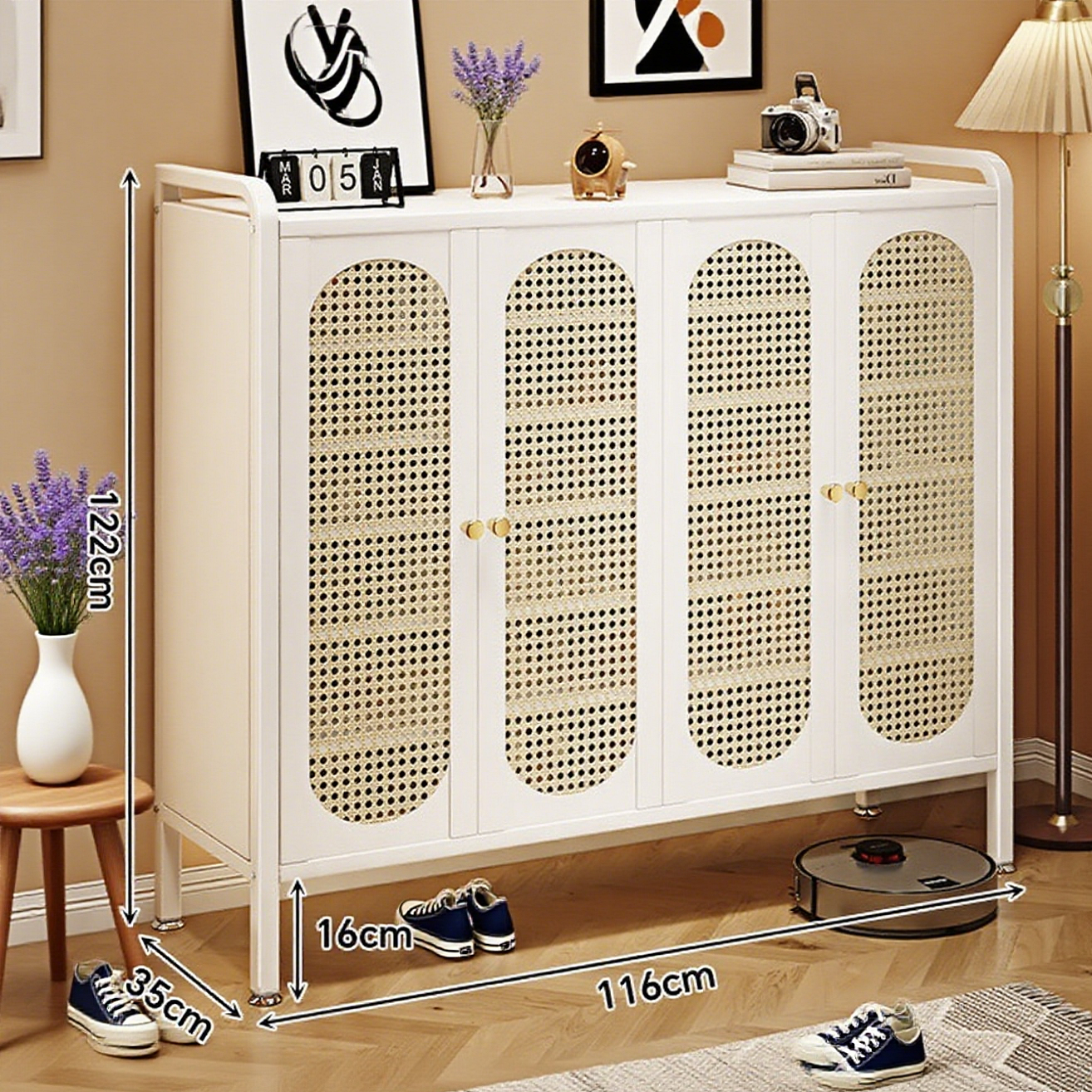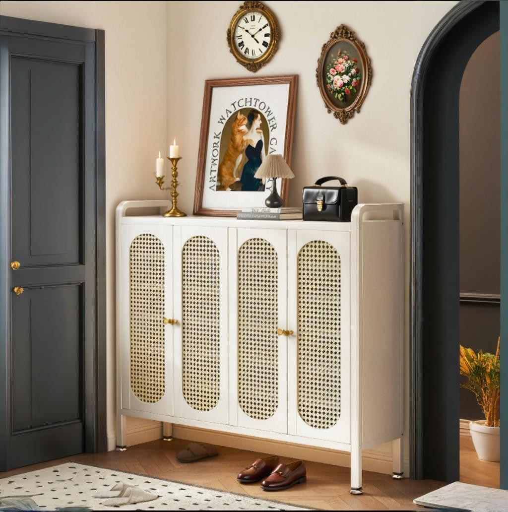 The Imitation Rattan Door Hallway Shoe Cabinet cleverly combines natural elements with modern functionality, creating a tidy and organized entryway. It not only effectively stores shoes but also adds a warm and rustic touch to the home environment with its unique imitation rattan design.