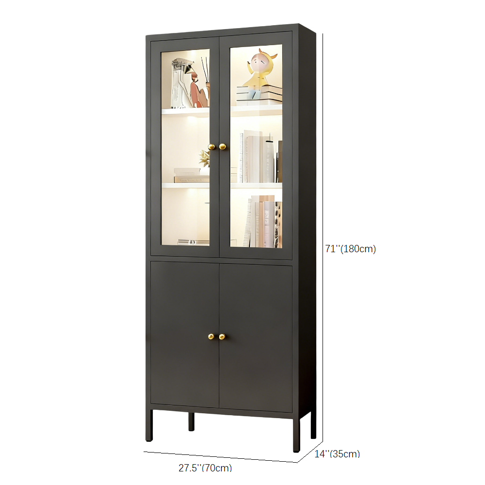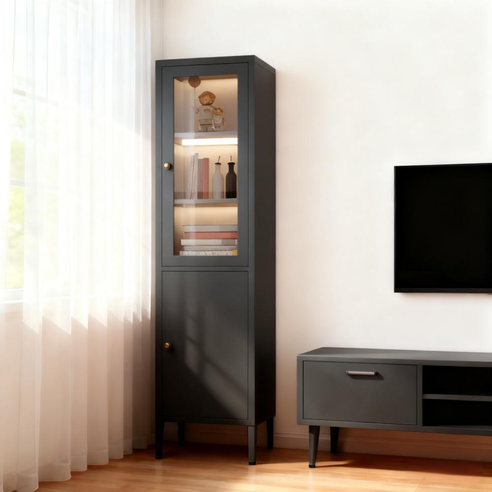 Modern steel cabinet with tempered glass door. Sleek metal frame, adjustable shelves. Perfectly displays and protects collectibles, books, ornaments, and decorative items in living rooms, studies, or offices. Minimalist, sturdy, and versatile.