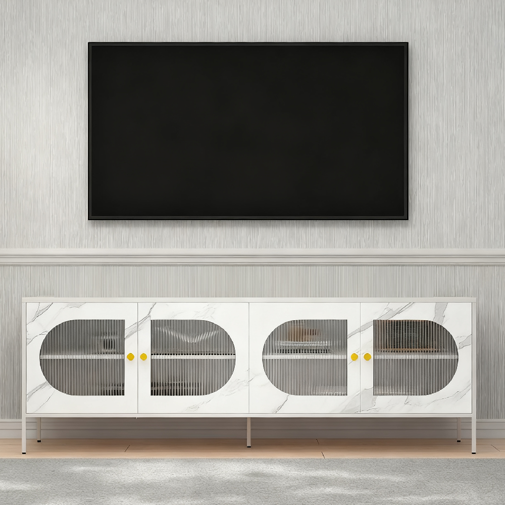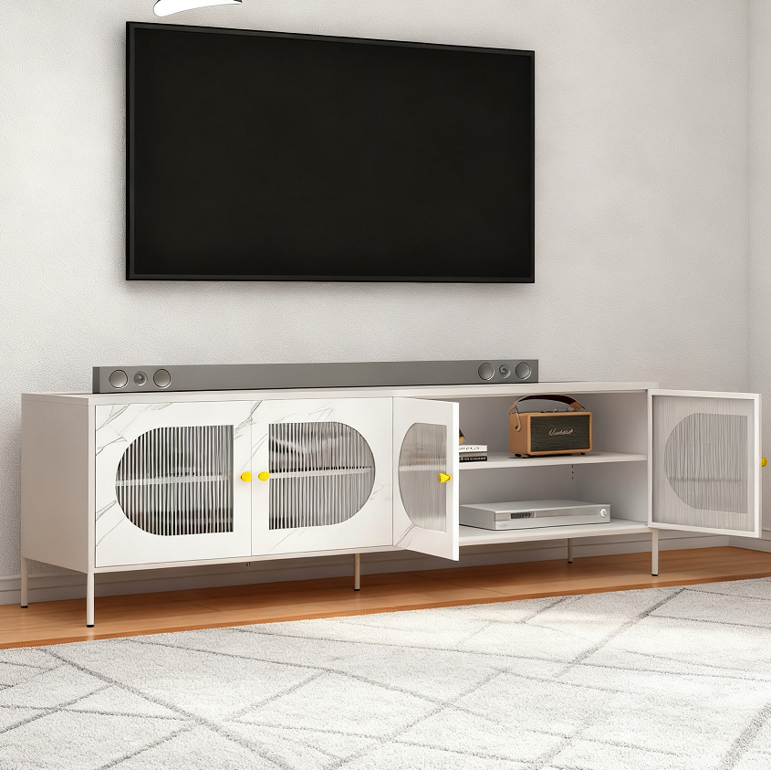 Modern steel tV stand with storage cabinet features 4 glass doors and offers ample storage for all your media essentials. The sturdy steel frame ensures durability, while the sleek, minimalist design adds a touch of elegance. Perfect for organizing consoles, books, and decor, this stand combines robust functionality with timeless style to complement any home aesthetic.