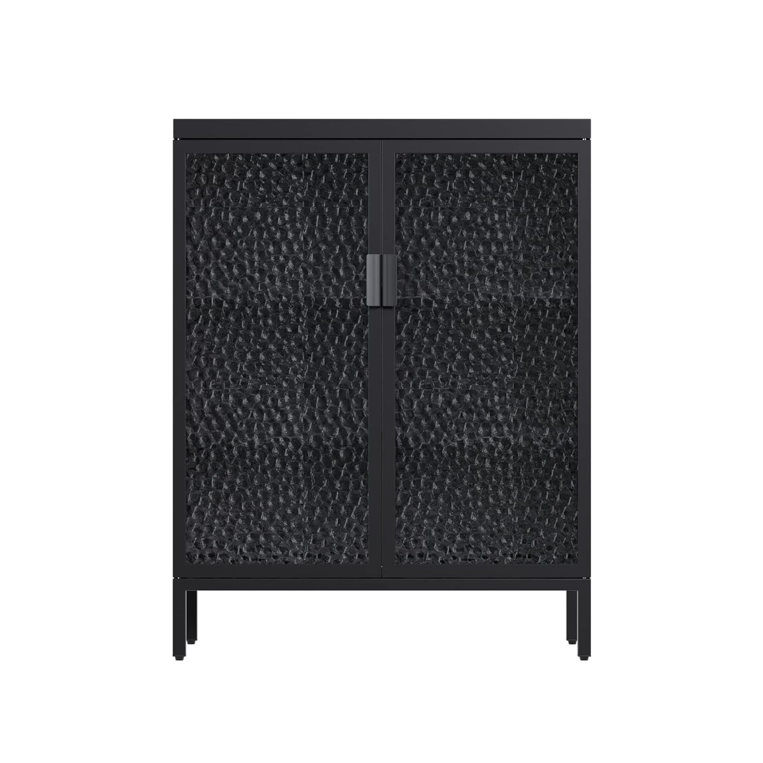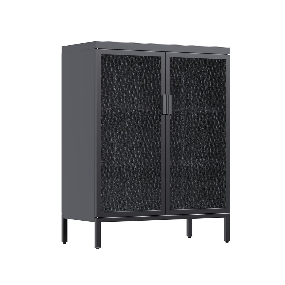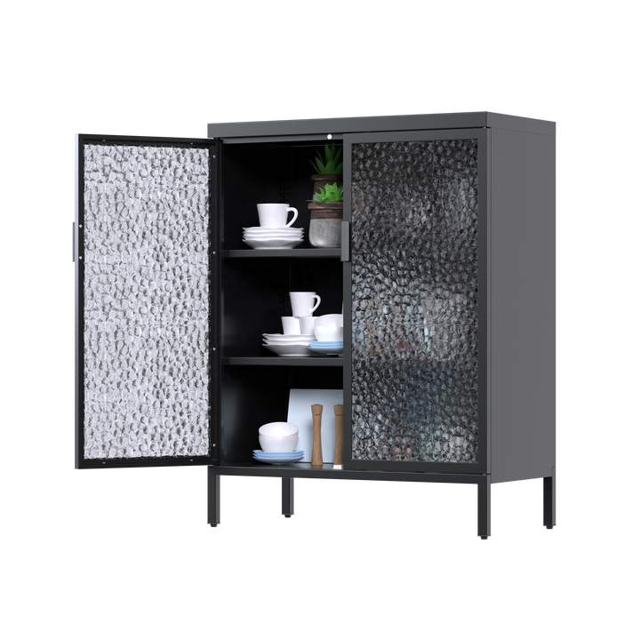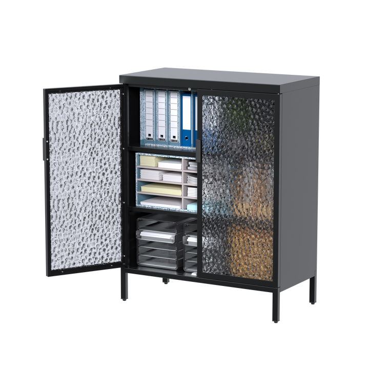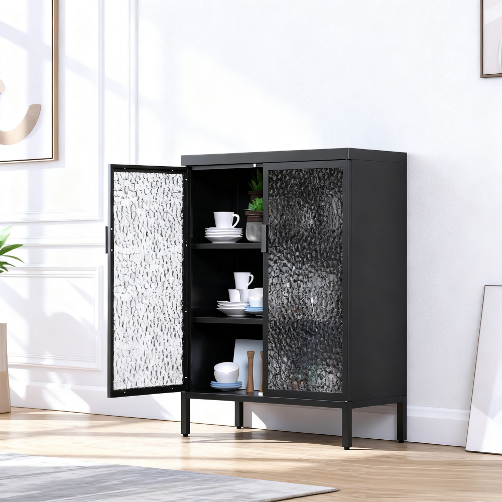 Elevate your decor with our Storage Cabinet with Glass Doors. Offering a chic matte-black finish and textured glass, it provides clear visibility and spacious storage. Perfect for displaying essentials stylishly while keeping them dust-free and organized.